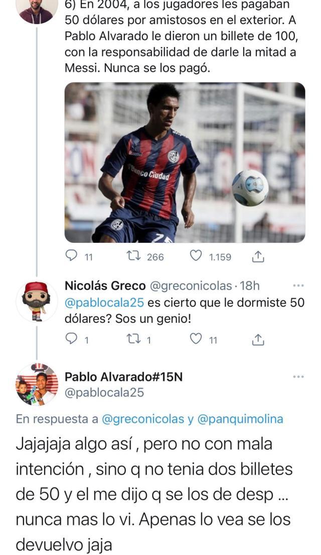 最近这则逸闻被媒体重新挖掘,一位记者在社交媒体上圈了阿尔瓦拉多,并问他是否真有其事,“@帕勃罗·阿尔瓦拉多 你真的欠了梅西50美元吗?你是个天才!”阿尔瓦拉多看到后哈哈一笑,开玩笑地回应道:“哈哈哈哈,差不多是这么回事,当时是因为我没有两张50美元的钞票,然后他告诉我可以晚点给他……我之后就再也没见过他了。如果我见到他的话,我会马上还钱的!”